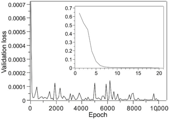 Therefore, the experimental results for the three samples that deviated from this rule were added, and it was determined experimentally whether learning was performed. In particular, experiments with 20 sheets (0.163 g total mass), 25 sheets (0.204 g total mass), and 30 sheets (0.244 g total mass) were conducted. The experimental results are provided in Table 3, which shows the average value for each of the four experiments. Table 4 shows the best results of 10 different training procedures, and it shows a dramatic improvement over the obtained training results for which only two-layer compression data were used. The validation loss during a training session is shown in Figure 3. The change in validation loss was similar to that in Figure 2. If the accuracy were improved to achieve this level, process design using deep learning could be applied to certain applications. Thus, the objective of this study, which was to establish a deep learning model with a certain degree of accuracy using as few training data as possible, was achieved. I believe that this method can be very effective in designing multilayer membranes using the CAPC method. Furthermore, the accuracy of the model can be improved by adding experimental training data.