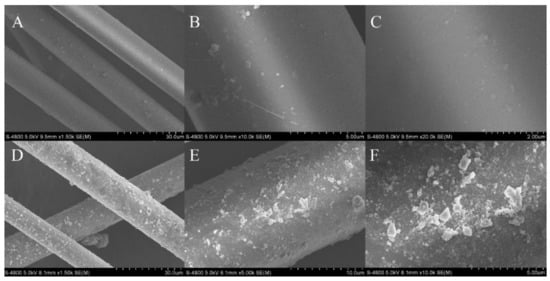SEM diagrams of (A–C) bare basalt fibers and (D–F) basalt fibers functionalized with covalent organic porous polymers.