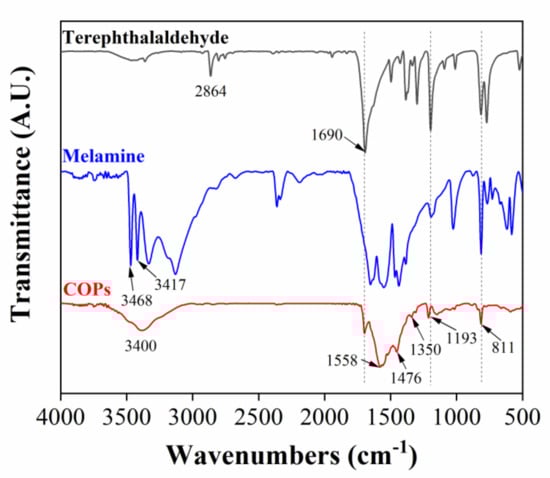 Fourier transform infrared (FT-IR) spectrum of COPs is shown in Figure 3. The disappearance of the primary amine group (3468 cm−1, 3417 cm−1) belonging to melamine indicates that melamine has been involved in the reaction. The disappearance of the C-H (2864 cm−1) vibration peak on terephthalaldehyde and the weakening of the C=O (1690 cm−1) stretching vibration peak indicate that terephthalaldehyde participates in the reaction. The peaks around 1558 and 1476 cm−1 are attributed to the C-N stretching vibration on the triazine ring. Meanwhile, the peaks at 1350 and 1193 cm−1 are caused by the C=N stretching vibration of melamine aromatic ring, and the peak at 811 cm−1 refers to the C-N bending vibration peak. These results further illustrate the successful synthesis of COPs.