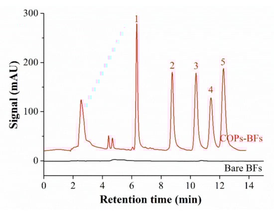 In order to confirm the contribution of COPs coating for extraction performance, the bare BFs tube was compared with COPs-BFs tube under the same conditions. As can be seen from Figure 4, there is no peak signal in the chromatogram on the bare BFs tube, that indicates almost no extraction ability. But the chromatographic peaks on the COPs-BFs tube are very obvious and even their heights are in the range of 100–250. These results proved that the extraction performance of the COPs-BFs tube was attributed from COPs coating.
