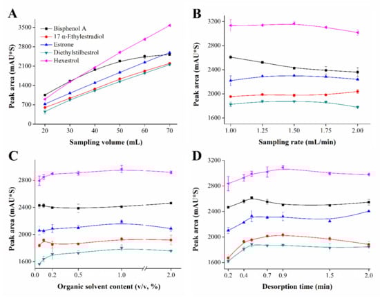 The images of extraction conditions optimization including (A) sampling volume, (B) sampling rate, (C) organic solvent content and (D) desorption time. Conditions: concentration of estrogens, 5 μg/L. The number of experiments to establish the plotted values was three (n = 3).