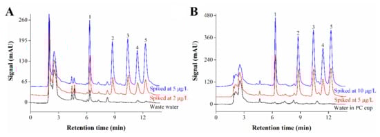 HPLC chromatograms of real water samples including (A) wastewater sample, spiked at 2 and 5 μg/L, and (B) water sample in polycarbonate (PC) cup, spiked at 5 and 10 μg/L. Peaks: (1) bisphenol A, (2) 17 α-ethylestradiol, (3) estrone, (4) diethylstilbestrol and (5) hexestrol. Conditions: sampling volume, 60 mL; sampling rate, 1.50 mL/min; methanol content in sample, 1.0% (v/v); desorption time, 2.0 min; detection wavelength, 202 nm.