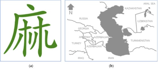 The evolution of the Chinese characters of the word “Cannabis sativa” or “Ma” (a) and the place of origin of the cannabis plant in the southern Caspian sea near Iran (b).