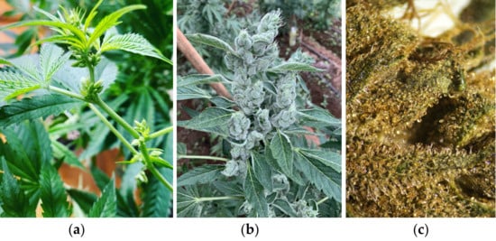 Cannabis belongs to the small family of Cannabaceae, which includes hop and Celtis berry. It is a dicotylate angiosperm that gives incomplete (lacking of petals) and also imperfect flower types with the separated sexual organs. The flower bears only pistils, known as pistillate flowers (or female flowers), and those with only the stamens are called staminate (or male flowers). In nature, cannabis produces either male or female flowers (dioecious), however, under short-day conditions, it may give both male and female flowers or monoecious. Plants are able to grow as high as 3 m or smaller depending on the varieties and the conditions of growth. The flowers often initiate as groups of flowers or as an axillary bud (Figure 2 a,b). The stem consists of the outermost layer of the epidermis, which is thin and coarse, and the primary and secondary layers that provide the better fiber quality. The innermost, which is the lignified secondary blast fiber, give the best fiber quality [32,33].