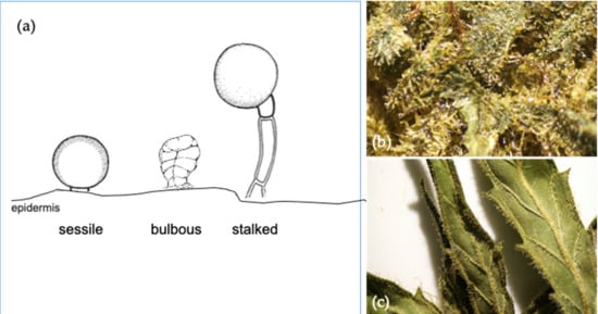 Different trichome structures for cannabis plants (a); the stalked types that are available on the floral surface (b); and sugar leaf structures with the presences of trichomes of the Cannabis sativa L. var. Kees’ Old School Haze® (available at https://dutch-passion.com) (c).