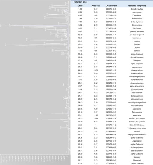 The chromatogram of the volatile profiles of Cannabis sativar L. var. Northern Light (https://www.seedstockers.com). Denotes terpenes isolated from dried florescence (50 mg) using headspace solid phase microextraction (SPME) with 50/30 μm carbowax-divinylbenzene, CAR-PDMS-DVB StableFlex fiber (Supelco, Bellefonte, PA, USA) followed by gas chromatography coupled with mass spectrometry [75,78].