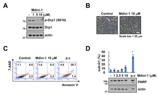 Figure 1. Effect of mdivi-1 on apoptosis in human renal carcinoma cell line Caki-1. (AD) Caki-1 cells were treated with 1–10 μM mdivi-1 for 24 h. The cell morphology (B) and cell death (C) were examined using interference light microscopy and Annexin V/7-AAD staining, respectively. The sub-G1 population and protein expression were detected by flow cytometry (D) and Western blotting (A,D) respectively. Positive control (p.c); TNF-α plus CHX. The values in graph (D) represent the mean ± SEM of three independent experiments. * p < 0.01 compared to the control.
