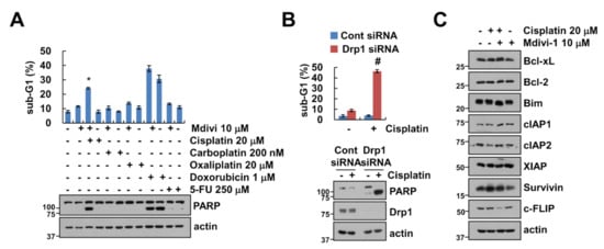 Figure 2. Mdivi-1 increases cisplatin-mediated apoptosis. (A) Caki-1 cells were treated with a combination of 20 μM cisplatin, 200 nM carboplatin, 20 μM oxaliplatin, 1 μM doxorubicin, and 250 μM 5-FU in the presence or absence of 10 μM mdivi-1 for 24 h. (B) Caki-1 cells were transfected with Cont or Drp1 siRNA and were treated with 20 μM cisplatin for 24 h. The sub-G1 population and protein expression were detected by flow cytometry (A,B) and Western blotting (AC), respectively. The values in graph (A,B) represent the mean ± SEM of three independent experiments. * p < 0.01 compared to the control. # p < 0.01 compared to cisplatin in Drp1 siRNA.