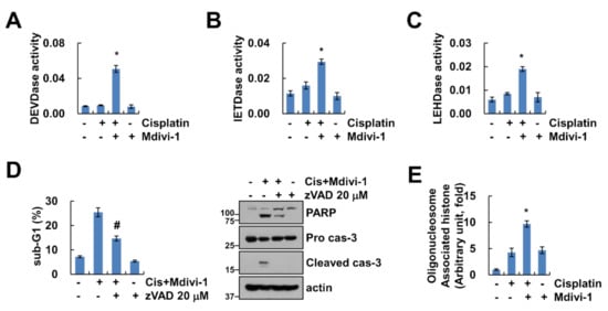 Figure 3. Combined treatment of mdivi-1 plus cisplatin induces caspase-dependent cancer cell death. (AC) Caki-1 cells were treated with 10 μM mdivi-1 alone, 20 μM cisplatin alone, or mdivi-1 plus cisplatin for 24 h, and measured DEVDase (caspase-3, A), IETDase (caspase-8, B) or LEHDase (caspase-9, C) activity. (D) Caki-1 cells were treated with 10 μM mdivi-1 plus 20 μM cisplatin in the presence or absence of 20 μM z-VAD for 24 h. The sub-G1 population and protein expression were detected by flow cytometry and Western blotting, respectively. (E) Caki-1 cells were treated with 10 μM mdivi-1 alone, 20 μM cisplatin alone, or mdivi-1 plus cisplatin for 24 h, and detected DNA fragmentation using detection kit. The values in graph (AE) represent the mean ± SEM of three independent experiments. * p < 0.01 compared to the control. # p < 0.01 compared to the mdivi-1 plus cisplatin.