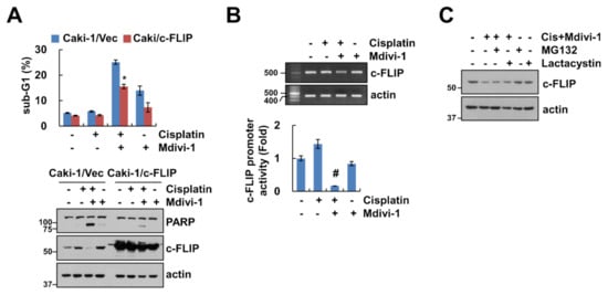 Figure 4. Combined treatment of mdivi-1 plus cisplatin inhibits c-FLIP expression at the transcription level. (A) Vector cells and c-FLIP-overexpressing cells were treated with 10 μM mdivi-1 alone, 20 μM cisplatin alone, or mdivi-1 plus cisplatin for 24 h. (B) Caki-1 cells were treated with 10 μM mdivi-1 alone, 20 μM cisplatin alone, or mdivi-1 plus cisplatin for 24 h. The mRNA expression and promoter activity were detected using reverse transcription polymerase chain reaction (RT-PCR) and luciferase activity kits, respectively. (C) Caki-1 cells were treated with 10 μM mdivi-1 plus 20 μM cisplatin in the presence or absence of 0.5 μM MG132 or 2.5 μM lactacystin for 24 h. The sub-G1 population and protein expression were detected by flow cytometry (A) and Western blotting (A,C), respectively. The values in graph (A,B) represent the mean ± SEM of three independent experiments. * p < 0.01 compared to the mdivi-1 plus cisplatin in Caki-1/Vec. # p < 0.01 compared to the control.