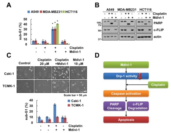 Figure 5. Effect of combined treatment of mdivi-1 and cisplatin on apoptosis in other cancer and normal cells. (AC) Indicated cancer cells (A,B) or normal renal TCMK-1 cells (C) were treated with 10 μM mdivi-1 alone, 20 μM cisplatin alone, or mdivi-1 plus cisplatin for 24 h. (D) The scheme indicating the mechanism of combined treatment of mdivi-1 and cisplatin. The sub-G1 population and protein expression were detected by flow cytometry (A,C) and Western blotting (B), respectively. The cell morphology was examined using interference light microscopy (C). The values in graph (A,C) represent the mean ± SEM of three independent experiments. * p < 0.01 compared to the control.