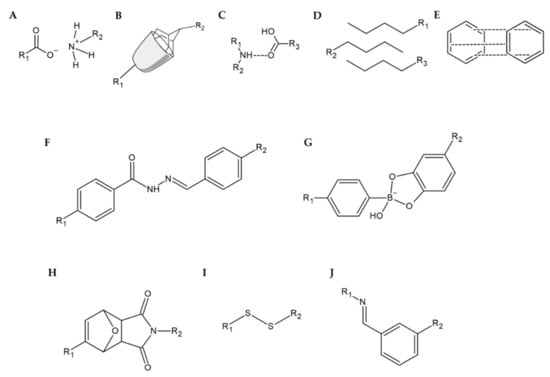 Example of self-healing mechanisms supported by (A) electrostatic interactions, (B) host–guest interactions, (C) hydrogen bonds, (D) hydrophobic interactions, (E) π–π stacking, (F) acylhydrazone bonds, (G) boronate-diol complexation, (H) Diels–Alder reaction, (I) disulfide bonds, and (J) imine bonds.