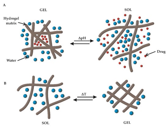 Sol–gel transition of a (A) pH-responsive HG and (B) thermoresponsive HG.