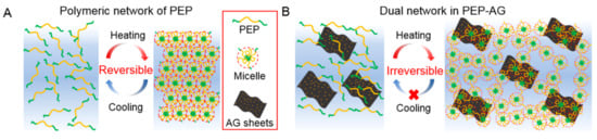 Illustration of the thermoresponsive mechanism of (A) PEP and (B) PEP-AG HGs. Adapted with permission from [102]. Copyright (2020) American Chemical Society.