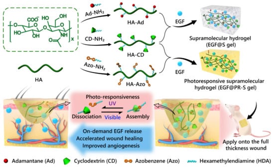 - Zhao, W.; Li, Y.; Zhang, X.; Zhang, R.; Hu, Y.; Boyer, C.; Xu, F.-J. Photo-responsive supramolecular hyaluronic acid hydrogels for accelerated wound healing. J. Control. Release 2020, 323, 24–35. [Google Scholar] [CrossRef]