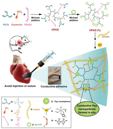 - Liang, S.; Zhang, Y.; Wang, H.; Xu, Z.; Chen, J.; Bao, R.; Tan, B.; Cui, Y.; Fan, G.; Wang, W.; et al. Paintable and Rapidly Bondable Conductive Hydrogels as Therapeutic Cardiac Patches. Adv. Mater. 2018, 30, 1704235. [Google Scholar] [CrossRef] [PubMed]