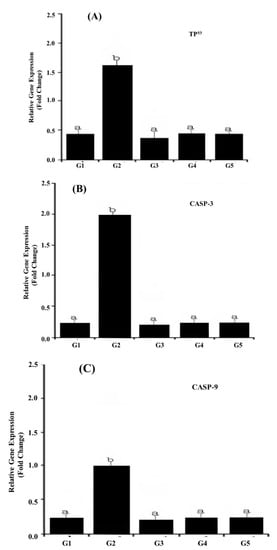 The co-ingestion of (Nano-CUR with TZ) to rats (G4 and G5) had profound modulatory effects on the observed TZ-mediated up-regulation of expression in TP53 (Figure 2A), CASP-3 (Figure 2B), and CASP-9 (Figure 2C) genes, leading to their transcriptional resistance. In response to TZ, the Nano-CUR supplementation adversely influenced the expression level of all three genes, which was approximately normalized to its level in the control group (G1).