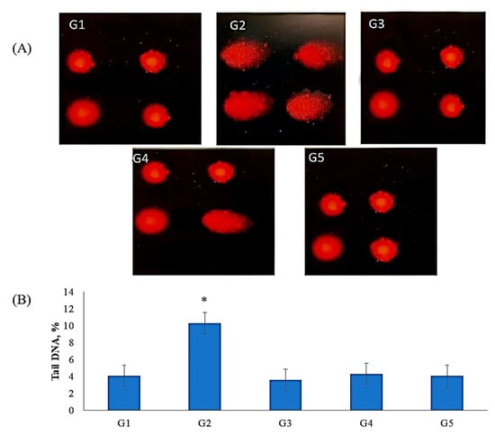 Comet assay results indicated that TZ owns a genotoxic influence in bone marrow cells of TZ-ingested rats (Figure 3A,B). This genotoxic effect was significantly (p < 0.01) increased in the DNA percentage of comet tails in the nuclei of bone marrow cells of TZ-ingested rats compared to the control (G1). The ingestion of Nano-CUR with TZ to rats (G4 and G5) suppresses the increases in DNA percentage of comet tails in the nuclei of bone marrow cells relative to tartrazine-ingested rats (G2). The suppression was higher in group 5 rats that ingested (2 g of Nano-CUR + 7.5 mg of TZ/kg b.w.) than that in group 4, which ingested (1 g of Nano-CUR + 7.5 mg TZ/kg b.w.) relative to group 2 and normalized to its level in control (G1). The ingestion of Nano-CUR alone to rats group3 (G3) showed no significant (p < 0.01) changes in the DNA comet tail in the nuclei of bone marrow relative to control (G1), whereas there was a significant (p < 0.05) decrease in the DNA tails in the comet assay of bone marrow relative to TZ-ingested rats (G2), as shown in Figure 3A,B.