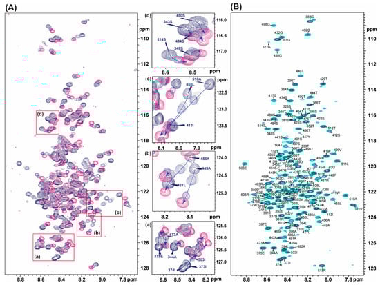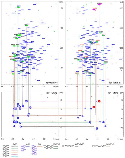 Additionally, aa(P-1) and aa(P + 1) were identified through the superposition of selective MUSIC proline spectra vs. different types of aa MUSIC spectra (Figure 2) and used as starting or reference points for assignment. Based on these data as well as data related to the type of aa for cross peaks in the 1H-15N HSQC spectrum of vHVD + GdmCl, the manual sequential assignment of the backbone resonances of vHVD + GdmCl was easily performed in a reasonably short time, achieving up to 95–99% by following the connectivity (1HNi/15Ni, 1HNi/13COi−1, 1HNi/13Cαi−1, and 1HNi/13Cβi−1) based on a combination of a set of high-resolution 25%NUS type 3D TROSY type correlation experiments.