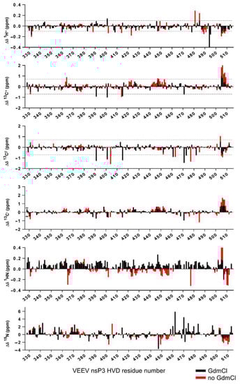 Figure 5. Superposition of the chemical shifts deviations from the random coil chemical shift calculated by POTENCI [21] for 1H(N), 15Ni, 13Cα, 13C, and 13C′ nuclei of native vHDV (red bars) vs. vHDV + GdmCl (black bars) are presented.