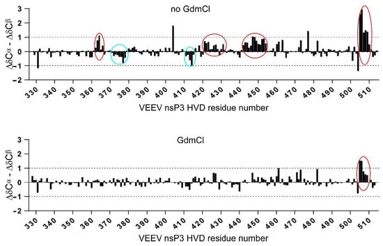 Figure 6. ΔδCα–ΔδCβ secondary chemical shifts for native vHVD (top) and vHVD + GdmCl (bottom). Positive values showing inside in 4 red circles indicate α-structure tendency, and negative values showing inside 2 blue circles indicate β-structure tendency. Addition of denaturing reagent (vHVD + GdmCl) indicates that this protein adopts mostly an extended coil-like structure but still displays a tendency toward α-helix propensity in C-terminal of protein, aa 505–510.