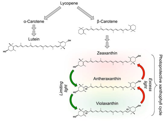 Carotenoids are responsible for the yellow or orange color of egg yolk [1], corn kernels [2], vegetables and fruits [3,4], and flowers [5,6]. The largest fraction of carotenoids, however, is masked by chlorophyll (see Section 3 and Section 4 below) in photosynthetic organisms. This underlying carotenoid presence in the green foliage of plants is revealed when chlorophyll is degraded and the leaves change color during the autumn in seasonally cold regions [7,8]. Carotenoids support a photosynthetic organisms’ unique task of using sunlight to make food, fuels, and other important molecules under the wide range of different, and continuously changing, light environments encountered in nature. Some of these carotenoids are essential micronutrients for humans. In addition to β-carotene’s role as provitamin A in human vision and immune function, essential roles are emerging for other carotenoids, such as zeaxanthin that is a key factor in vision protection, an anti-inflammatory agent, and also supports brain function and performance of complex mental tasks (for a review, see [9]). Since leaf zeaxanthin level is highly variable and responds strongly to the light environment as well as plant growth rate, it is of interest to define plant growth conditions and species that simultaneously maximize zeaxanthin production and plant productivity. In addition to such environmental manipulation, genetic manipulation of leaf carotenoid level is being explored for the development of more productive and/or resource-efficient crops (see, e.g., [10]). Our review summarizes leaf carotenoid levels’ dynamic adjustment in response to a wide range of natural environments with different combinations of light level, temperature, and other factors. We refer to others for authoritative reviews on carotenoid function in photosynthetic organisms other than plants [11,12,13,14,15].