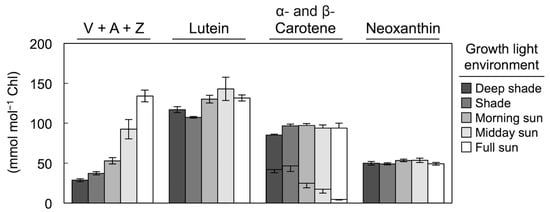 Levels of the primary carotenoids (relative to chlorophyll) present in leaves of 19 species growing in a subtropical rainforest (Dorrigo National Park, New South Wales, Australia) across five light environments from deep shade to full sunlight. Plants growing in Deep shade were never exposed to direct sunlight, those in Shade likely experienced brief periods of high light (sunflecks), those that received Morning or Midday sun were growing where gaps in the canopy permitted direct sunlight to penetrate for longer periods of time, and the most exposed category of plants (Full sun) was at the northern edge of the forest or in the upper canopy where the plants received full sunlight throughout the day. The three carotenoids of the xanthophyll cycle (violaxanthin, antheraxanthin, and zeaxanthin) were pooled together (V + A + Z), as were α-carotene (lower portion of each column) and β-carotene (upper portion of each column). Means ± standard errors are shown. For Deep shade, n = leaves from 10 plants from among seven species. For Shade, n = leaves from 12 plants from among eight species. For Morning sun, n = leaves from seven species. For Midday sun, n = leaves from 4 plants from among three species. For Full sun, n = leaves from 8 plants from among six species. Data from Logan et al. [25].