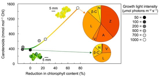 Level of carotenoids (relative to chlorophyll) as a function of reduction in chlorophyll content in fronds of duckweed (Lemna gibba) that had developed under continuous light ranging across six growth light intensities from 50 to 1000 µmol photons m−2 s−1 (i.e., from 4.32 to 86.4 mol photons per square meter per 24-h period). Reduction in chlorophyll content is expressed as percent reduction relative to the chlorophyll level in fronds grown under the lowest light intensity of 50 µmol photons m−2 s−1. Images of duckweed colonies that developed under 50 and 1000 µmol photons m−2 s−1 are also shown, as well as pie diagrams depicting the relative levels of each of the six carotenoids present in those fronds (where total pie area represents carotenoid content per chlorophyll). Chl = chlorophyll, V = violaxanthin, A = antheraxanthin, Z = zeaxanthin, L = lutein, β-C = β-carotene, and N = neoxanthin. Data for fronds grown under 100, 200, 500, and 700 µmol photons m−2 s−1 are derived from Stewart et al. [31]. Data for fronds grown under 50 and 1000 µmol photons m−2 s−1 are from Stewart et al. [32].