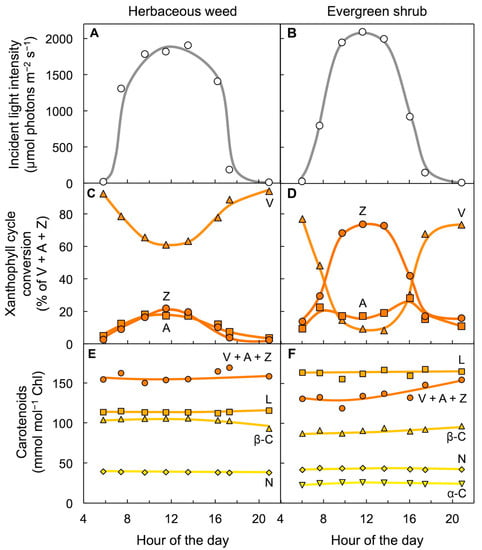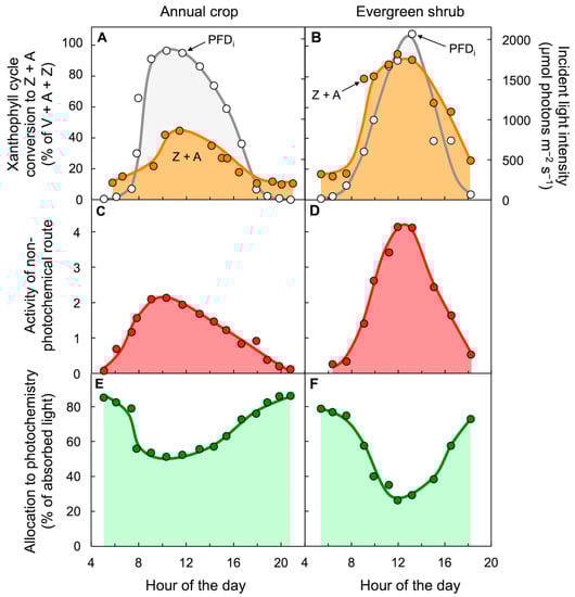 Diurnal characterization of (A,B) light incident on the upper leaf surface (PFDi) and percent of the xanthophyll cycle present as zeaxanthin and antheraxanthin (Z + A), (C,D) dissipation of excitation energy as thermal energy via a regulated non-photochemical route (quantified from chlorophyll fluorescence as Stern–Volmer quenching), and (E,F) percentage of absorbed photons allocated to photochemistry (quantified from chlorophyll fluorescence as photosystem II efficiency) in leaves of the herbaceous annual sunflower (A,C,E) and the woody evergreen Euonymus kiautschovicus (B,D,F) on summer days. V = violaxanthin. Data for sunflower are from Demmig-Adams and Adams [48] and Demmig-Adams et al. [49]. Data for E. kiautschovicus are from Verhoeven et al. [50].