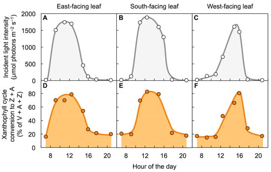 Field characterization of the evergreen with different leaf orientations confirmed, and expounded on, these findings [41]. East-facing leaves that received peak levels of sunlight in the morning reached their maximal zeaxanthin levels earlier in the morning (Figure 5A,D); south-facing leaves receiving peak sunlight closer to midday exhibited peak zeaxanthin leaves at midday (Figure 5B,E); and west-facing leaves experiencing peak light level in the afternoon reached peak zeaxanthin levels later in the day (Figure 5C,F). Each leaf thus formed the most zeaxanthin when experiencing the greatest levels of unutilized light and re-converted zeaxanthin to violaxanthin as light levels declined again over the course of a day. These findings illustrate the importance of paying close attention to orientation/exposure and incident light level in studies of xanthophyll cycle operation (see also [42,43,44,45]).