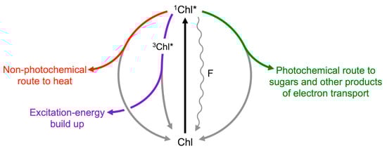 Possible fates of excitation energy once a photon of light is absorbed by a molecule of chlorophyll resulting in conversion from the ground state (Chl) to the singlet excited state (1Chl*). When light is not saturating for photosynthesis, the majority of chlorophyll molecules pass their excitation energy to neighboring chlorophyll molecules via resonance transfer (resulting in return of the first chlorophyll molecule to its ground state). This process can be repeated until the energy reaches a reaction center chlorophyll molecule that undergoes charge separation, resulting in an electron entering the photosynthetic electron transport chain (photochemical route denoted in green, returning the reaction center chlorophyll molecule to its ground state). As light levels become increasingly excessive, excess excitation energy is increasingly dissipated preemptively as thermal energy via a regulated pathway (non-photochemical route denoted in red that also returns the excited chlorophyll molecule to its ground state; see text for regulation of the xanthophyll cycle and engagement of zeaxanthin in energy dissipation). When the combined levels of photochemical and regulated non-photochemical routes are insufficient to swiftly de-excite all excited singlet chlorophyll, conversion to triplet excited chlorophyll (3Chl*) takes place, which represents a temporary build-up of excess excitation energy (purple route). In the presence of molecular oxygen, triplet excited chlorophyll returns to its ground state by transfer of excitation energy to oxygen, resulting in the formation of singlet excited oxygen (not shown). A small percentage of the chlorophyll molecules return to ground state directly from the singlet excited state (wavy line), emitting fluorescence (F). Although only representing a very small fraction of the excitation energy, and thus not a major route for deexcitation, fluorescence emission provides valuable quantitative information about the other fates (particularly the regulated non-photochemical and photochemical routes).