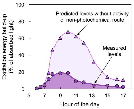 Levels of measured (quantified from chlorophyll fluorescence as photosystem II reduction state; purple circles) and predicted (calculated for the absence of non-photochemical energy dissipation; purple triangles) build-up of excess excitation energy over the course of a day in the east-facing surface of a cactus (Nopalea cochenillifera) cladode. Data are from Demmig-Adams and Adams [19].