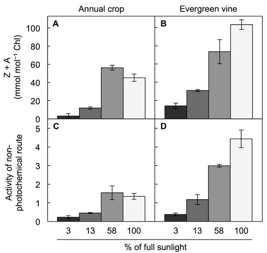 Foliar levels of (A,B) zeaxanthin + antheraxanthin (Z + A) per chlorophyll (Chl) and (C,D) energy dissipation via the non-photochemical route (quantified from chlorophyll fluorescence as Stern–Volmer quenching) at midday during the summer in the herbaceous annual pumpkin (A,C) and the evergreen groundcover Vinca major (B,D). Plants were grown in the field under a shade cloth, resulting in penetration of 3% of full sunlight (black columns), 13% of full sunlight (dark gray columns), or 58% of full sunlight (medium gray columns), or with no shade cloth (100% or full sunlight; light gray columns). Mean values ± standard deviations, n = three leaves. Data are from Logan et al. [36].