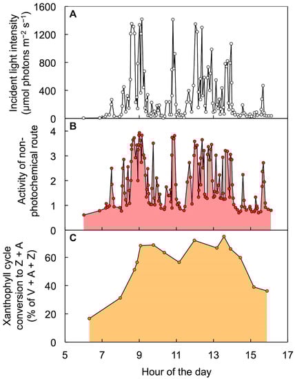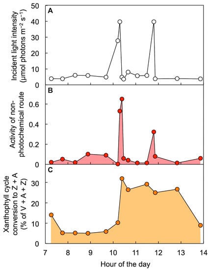Diurnal characterization of (A) light incident on the upper leaf surface, (B) level of energy dissipation via a regulated non-photochemical route (quantified from chlorophyll fluorescence as Stern–Volmer quenching), and (C) percent of the xanthophyll cycle pool present as zeaxanthin + antheraxanthin (Z + A) in leaves of Alocasia brisbanensis in the understory of a subtropical rainforest (Dorrigo National Park, New South Wales, Australia). V = violaxanthin. Data are from Logan et al. [68].