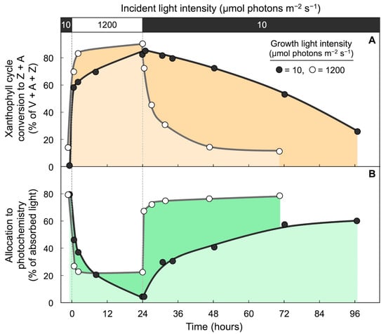 Impact of sudden transfer from low light (10 µmol photons m−2 s−1) to high light (1200 µmol photons m−2 s−1; open bar across top) for 24 h followed by return to low light (black bar across top) on leaves of Schefflera arboricola that developed in either low light (dark circles) or in high light in a greenhouse where leaves received a peak photon flux density of 1200 µmol photons m−2 s−1 (open circles). (A) Percent of xanthophyll cycle converted to zeaxanthin + antheraxanthin and (B) percentage of absorbed photons allocated to photochemistry (quantified from chlorophyll fluorescence as photosystem II efficiency). V = violaxanthin. Data are from Demmig-Adams et al. [73].