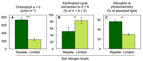 Impact of growth with replete (dark green columns) or limiting (light green columns) soil nitrogen levels on (A) chlorophyll content, (B) percent of the xanthophyll cycle converted to zeaxanthin + antheraxanthin (Z + A), and (C) percentage of absorbed photons allocated to photochemistry (quantified from chlorophyll fluorescence as photosystem II efficiency) in leaves of spinach grown in a naturally lit greenhouse. V = violaxanthin. Means ± standard deviations. Asterisks denote statistically significant differences between soil nitrogen levels (Student’s t-test; ** = p < 0.01, *** = p < 0.001). Data are from Logan et al. [74].