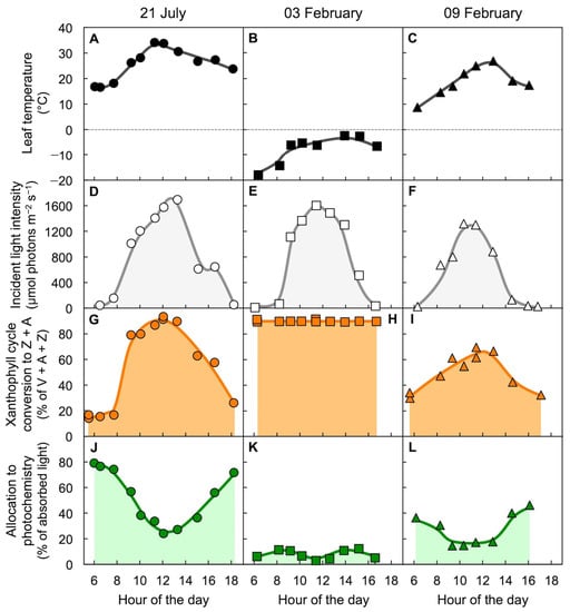 Diurnal characterization of (A,B,C) leaf temperature, (D,E,F) light incident on the upper leaf surface, (G,H,I) percent of the xanthophyll cycle present as zeaxanthin and antheraxanthin (Z + A), and (J,K,L) percentage of absorbed photons allocated to photochemistry (quantified from chlorophyll fluorescence as photosystem II efficiency) in leaves of the woody evergreen Euonymus kiautschovicus on a warm day during summer (A,D,G,H; circles), on a cold day in winter (B,E,H,I; squares), and a subsequent warmer winter day (C,F,I,L; triangles). V = violaxanthin. Data are from Verhoeven et al. [50].