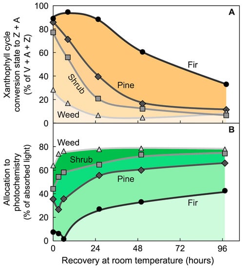 Figure 16 shows the relaxation kinetics of xanthophyll cycle conversion state and the percent of absorbed light available for utilization in overwintering leaves of different species upon transfer from cold field to warm laboratory conditions. An herbaceous, biennial weed that grows only in locations where photosynthesis and some level of growth can be maintained throughout the winter quickly decreased xanthophyll conversion to Z + A and increased the percentage of absorbed light available for utilization in photosynthesis when transferred to warm laboratory conditions on a cold winter day [93]. A similar response was exhibited by an overwintering evergreen shrub (cf. Figure 15; [93]). In contrast, two overwintering conifers exhibited slower relaxation kinetics of both parameters (see also [34]). Such a response may be associated with a growth arrest pattern in some species, which can be considered an adaptation to extreme environmental conditions. These findings show that, despite widely varying relaxation kinetics, close correlations were often seen in overwintering leaves between continuous maintenance of high levels of Z + A and a state of low conversion of absorbed light to photochemistry.