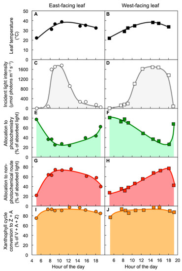 Diurnal characterization of (A,B) leaf temperature, (C,D) light incident on the upper leaf surface, (E,F) percentage of absorbed photons allocated to photochemistry (quantified from chlorophyll fluorescence as photosystem II efficiency), (G,H) percent of absorbed photons allocated to the regulated non-photochemical route (derived from maximal photosystem II efficiency as quantified via chlorophyll fluorescence), and (I,J) percent of the xanthophyll cycle present as zeaxanthin and antheraxanthin (Z + A) in east-facing (A,C,E,G,I) or west-facing (B,D,F,H,J) leaves of Yucca brevifolia growing in the Mojave desert on a hot day during summer. V = violaxanthin. Data are from Barker et al. [45].
