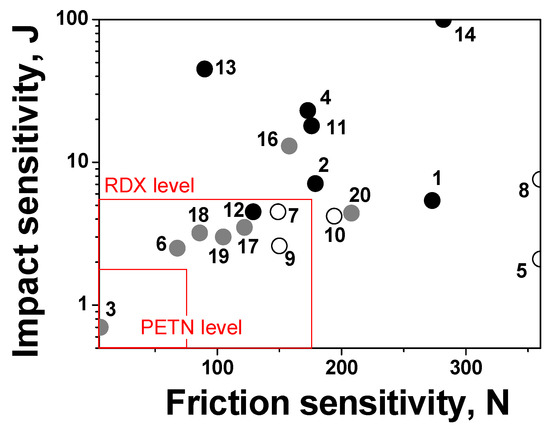 - Smirnov, A.S.; Voronko, O.; Korsunskii, B.L.; Pivina, T.S. Impact and Friction Sensitivity of Energetic Materials: Methodical Evaluation of Technological Safety Features. Chin. J. Explos. Propellants 2015, 38, 1–8. [Google Scholar] [CrossRef]
