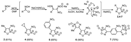 - Fershtat, L.L.; Larin, A.A.; Epishina, M.A.; Kulikov, A.S.; Ovchinnikov, I.V.; Ananyev, I.V.; Makhova, N.N. Regioselective synthesis of bifuroxanyl systems with the 3-nitrobifuroxanyl core via a one-pot acylation/nitrosation/cyclization cascade. Tetrahedron Lett. 2016, 57, 4268–4272. [Google Scholar] [CrossRef]