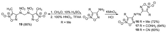 - Fershtat, L.L.; Ovchinnikov, I.V.; Epishina, M.A.; Romanova, A.A.; Lempert, D.B.; Muravyev, N.V.; Makhova, N.N. Assembly of Nitrofurazan and Nitrofuroxan Frameworks for High-Performance Energetic Materials. ChemPlusChem 2017, 82, 1315–1319. [Google Scholar] [CrossRef]