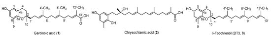 13-[(R)-6-Hydroxy-2,8-dimethylchroman-2-yl]-2,6,10-trimethyltrideca-2E,6E,10E-trienoic acid (1), colorless oil; Yield 87%; 1H-NMR (CDCl3): δ 6.86 (t, J = 6.0 Hz, 1H, C11′-H), 6.47 (d, J = 2.4 Hz, 1H, phenyl C5-H), 6.38 (d, J = 2.4 Hz, 1H, phenyl C7-H), 5.12 (t, J = 7.2 Hz, 2H, C3′-H and C7′-H), 2.69 (t, J = 6.8 Hz, 2H, C4-H2), 2.35–2.24 (m, 2H, C10′-H2), 2.16–1.92 (m, 11H, C2′-H2, C5′-H2, C6′-H2, C9′-H2 and C9-H3), 1.85–1.45 (m, 13H, C1′-H2, C3-H2, C4′-CH3, C8′-CH3 and C12′- CH3), 1.26 (s, 3H, C10-H3); 13C-NMR (CDCl3): δ 172.0 (C=O), 147.8 (phenyl C-6), 146.1 (C-11′), 145.0 (phenyl C-8a), 135.0 (C-8′), 133.8 (C-4′), 127.5 (C-12′), 126.8 (phenyl C-8), 125.3 (C-3′), 124.6 (C-7′), 121.3 (phenyl C-4a), 115.7 (phenyl C-7), 112.7 (phenyl C-5), 75.4 (C-2), 39.8 (C-5′), 39.6 (C-1′), 38.1 (C-9′), 31.5 (C-3), 27.6 (C-6′), 26.6 (C-10′), 24.2 (C-10), 22.6 (C-4), 22.3 (C-2′), 16.2 (C-9), 16.1 (C8′-CH3), 15.9 (C4′-CH3), 12.2 (C12′-CH3); MS (ESI) m/z 425.2 [M − H]−; HRMS (ESI) m/z = 449.2662 calcd. for C27H38O4Na [M + Na]+; found: 449.2662. The NMR data are in line with those reported [10].