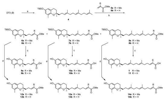 We have been using DT3 (3) as a starting material to synthesize its derivatives [17,18,19]. Garcinoic acid can be considered as the long-chain metabolite of DT3 resulting from ω-hydroxylation and ω-oxidation of DT3 and differs from DT3 only by bearing a trans-13′-carboxylic acid group [20]. As such, our first attempt to synthesize garcinoic acid and its homologs involves cross metathesis reaction between TBS protected DT3 4 [17] and methyl methacrylate (5a) or methyl acrylate (5b) in the presence of Grubbs catalyst, followed by ester group hydrolysis and TBS deprotection (Scheme 1). Although the metathesis reaction led to a mixture of three products, they are readily separable and it was a very efficient approach to obtain garcinoic acid and its homologs with two different tail lengths (Scheme 1). The corresponding carboxylate esters 12–14 were obtained by treating 6–8 with TBAF to remove the TBS group.