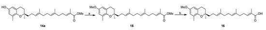 3.2.6. Synthesis of 13-[(R)-6-methoxy-2,8-dimethylchroman-2-yl]-2,6,10-trimethyltrideca-2E,6E,10E-trienoic Acid (16)