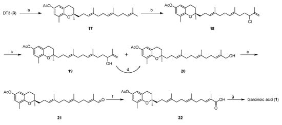 While the method developed in Scheme 1 provided a rapid path to garcinoic acid and its homologs, the yield of garcinoic acid was low. To the best of our knowledge, only one synthetic method for garcinoic acid has been reported but requires >15 steps [10]. In an effort to provide a facile synthetic route for garcinoic acid with mild conditions and short synthetic sequence, we tried a method to selectively oxidize the terminal methyl group of DT3 (1). Our strategy involves a regioselective chlorination of acetyl protected DT3 17 in the presence of PhSeCl and NCS, followed with an AgBF4-mediated hydrolysis of chloride 18 to afford a mixture of alcohols 19 (26%, 2 steps) and 20 (32%, 2 steps) that can be readily separated by column chromatography. The yield of the desired primary alcohol can be further improved by conversion of 19 into 20 via mesylation and subsequent hydrolysis with acetone/H2O. Dess–Martin oxidation of alcohol 20 by using Dess–Martin periodinane (DMP) resulted into aldehyde 21, which was further converted to the corresponding carboxylic acid compound 22 under Pinnick oxidation condition. Removal of the acetyl group on 22 led to the final product garcinoic acid (Scheme 3). In our synthetic route, garcinoic acid was obtained in 6 steps with a total yield of ~18%, which is more efficient than the previously reported method [10].