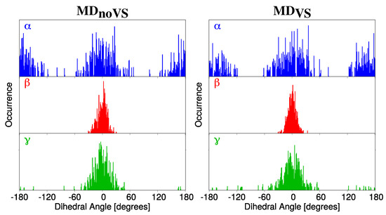 DDFs were extracted for four dihedral angles (, , , , see Figure 2 for their definition) from both MD and MD. , , and represent the dihedral angle between the molecular plane and the selected hydroxyl groups, whereas describes the relative orientation of the phenyl group with respect to the main molecular plane (see Figure 2). The , , DDFs for Myricetin M as obtained from both MD and MD are reported in Figure 3. The same DDFs for the other flavonoids are reported in Figures S1–S3 in the Supplementary Materials (SM).