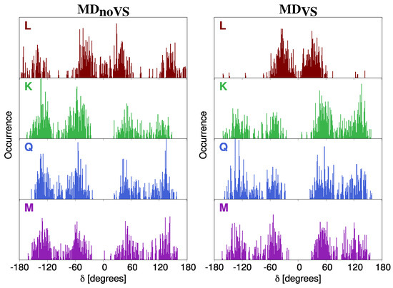 DDF of dihedral angle of L (brown), K (green), Q (blue) and M (purple) as obtained from MD (left) and MD (right).