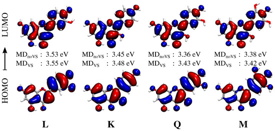The convoluted spectrum of each flavonoid is characterized by two main bands. The first is placed at about 3.4 eV (364 nm) for K, Q and M, whereas for L it is blueshifted by about 0.15 eV (349 nm); the second band is centered in the region 4.7–5 eV (264–248 nm) for all systems. For K, Q, and M, the spectrum is dominated by the second peak, whose intensity is almost twice that of the first band. A different situation is reported for L, for which the two bands have almost equal intensities. The first band at about 3.4–3.6 eV (364–344 nm) is due to a pure HOMO–LUMO transition, whereas the second band results from a combination of several excitations. In order to investigate the nature of the first electronic transition, the involved molecular orbitals (MOs) are plotted in Figure 7. We see that the first excitation can easily be identified as a transition. In particular, we note that the carbonyl Oxygen atom (O4) takes part into the electronic excitation. Therefore, the differences between L and the other flavonoids reported for the first transition can be ascribed to the fact that in K, Q, and M, O3 is hydrogen bonded to the O4 hydroxyl group (see Figure 7, right), whereas in L O3 is free to form a (weak) HB interaction with the surrounding water molecules. As a consequence, the excitation is redshifted by about 0.15 eV for K, Q, and M. Figure 7 also reports excitation energies of the first electronic transition for both MD and MD. Moving from K to Q and M, a redshift is described by both MDs. This behavior can be explained by considering that the number of hydroxyl groups increases moving from K to M. As a consequence, a larger number of HB sites with the surrounding water molecules are involved, yielding a redshift which is typically observed for transitions [38,80,81,82,83]. Such a redshift is not present in Q and M because the bridge OH group in M is only weakly involved in HB interactions with the solvent (see Table 1). We also note that MD always predicts higher excitation energies than MD. This is not surprising and it is once again related to the reduced number of water molecules hydrogen bonded to O3 (see Table 1).