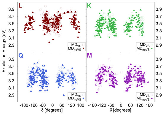 As mentioned above, a large spreading in both energies and intensities is reported in stick spectra depicted in Figure 6. In order to investigate the origin of such a variability, we studied how the excitation energy depends on the dihedral angles previously analyzed (see Section 2.2.1). In particular, Figure 8 reports computed excitation energies of the first transition as a function of the dihedral angle (see Figure 2 for its definition). Similar plots for , , and are given in Figures S8–S10 in the SM. We see that the computed values are clusterized around the most populated dihedral angles for both MD runs (see Figure 4). In addition, independently from the value of the dihedral angle, computed energies span the region between 2.9 and 3.9 eV. This demonstrates that the origin of the large variability reported in the stick spectra is the spatial arrangement of water molecules around the solutes.